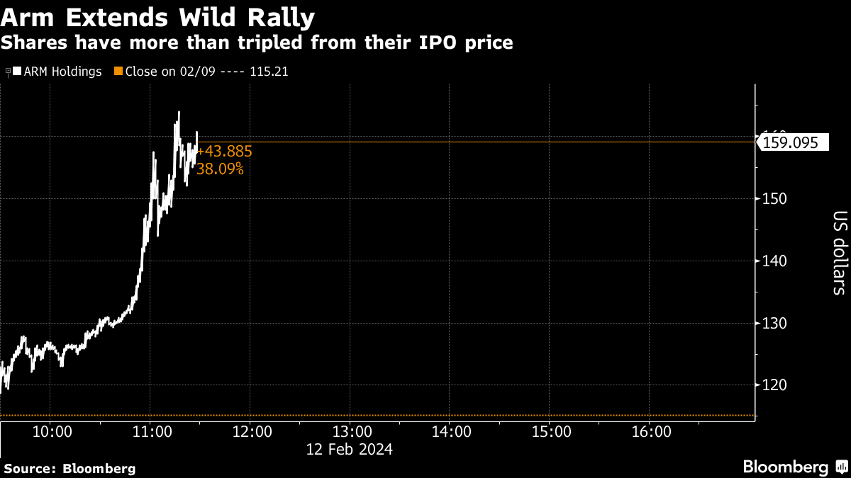 “你在这里看到的是对任何与人工智能有关的事物的疯狂追捧,” Triple D Trading的交易员Dennis Dick说道。“我们已经看到了这种情况在英伟达身上,现在Arm也被归入了同一类别。它并不是一个纯粹的人工智能公司,它还做其他的事情,但它确实有这个部门,这就是推动股价上涨的原因。这只是关于人工智能的繁荣。”
