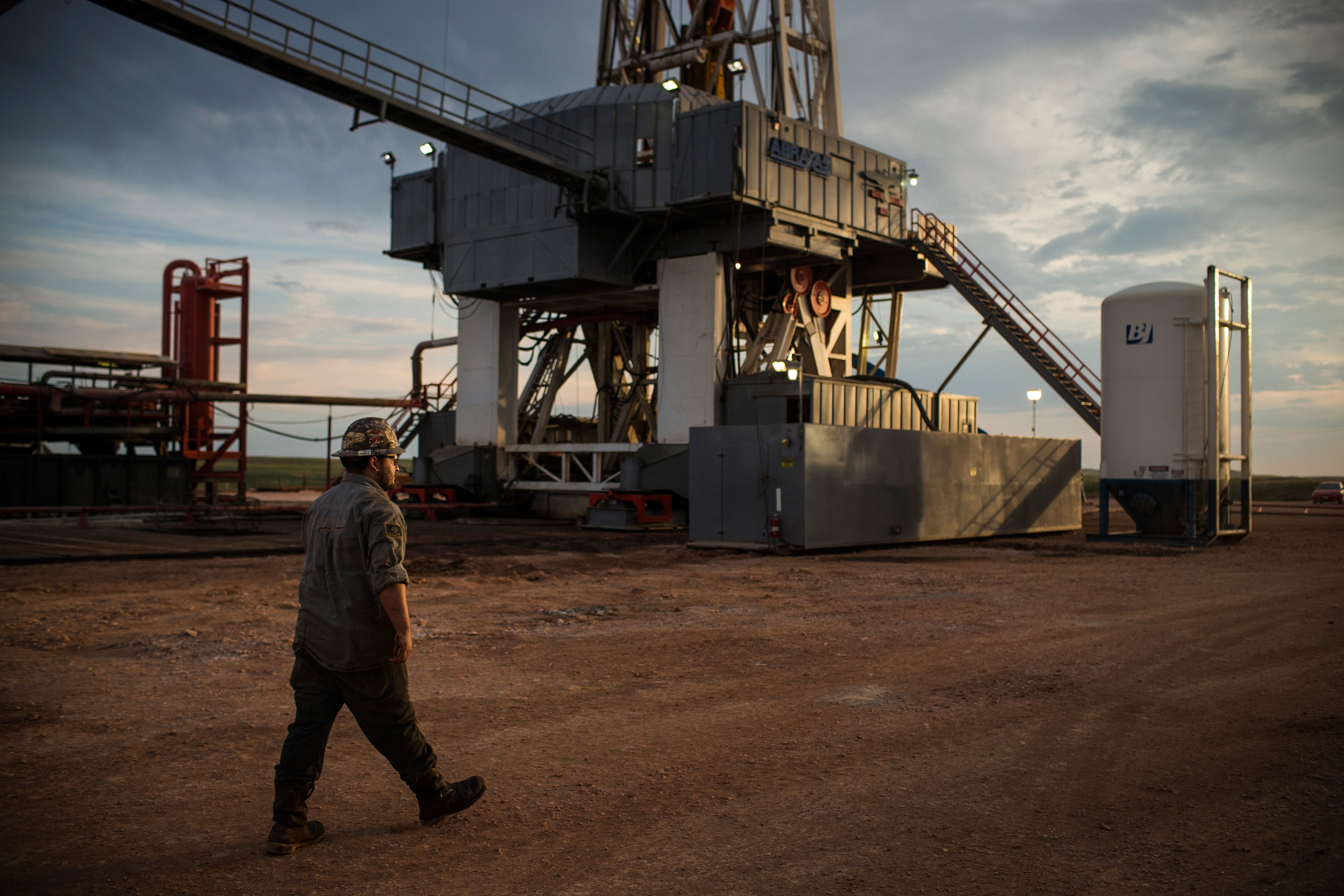 一名工人走过北达科他州沃特福德城外的巴肯页岩地区的石油钻探现场。