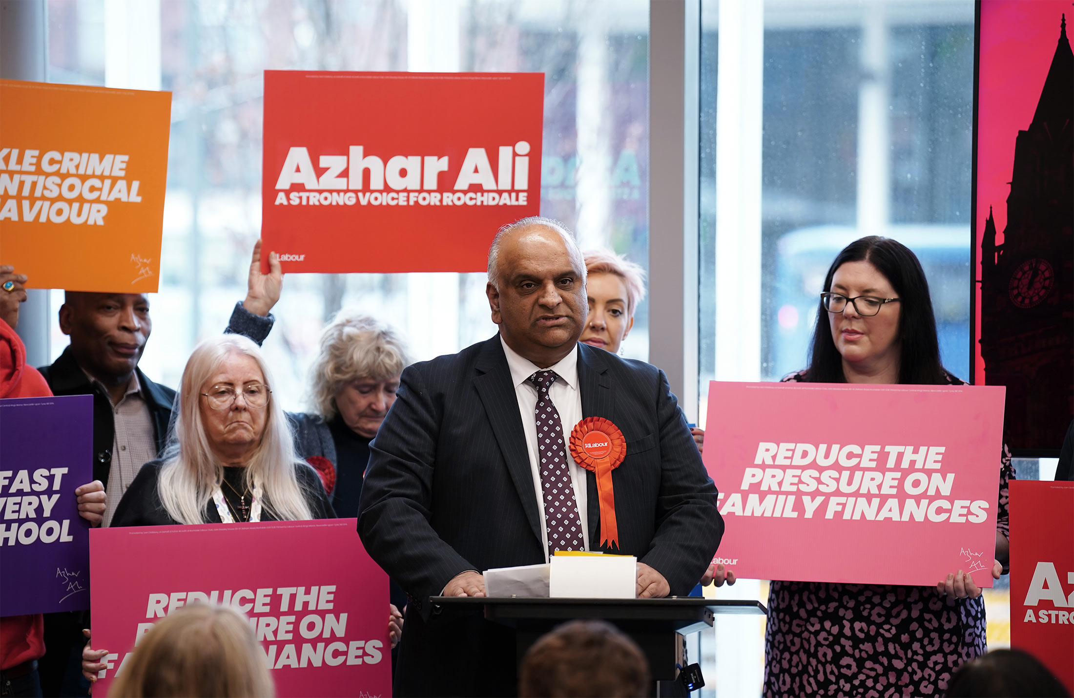 阿兹哈尔·阿里是工党候选人,参加2月29日在罗奇代尔举行的补选。袭击发生后不久,他在接受《星期日邮报》采访时表示,以色列“允许”袭击发生,给他们“无拘无束地做任何他们想做的事情”的绿灯。《星期日邮报》报道称,他们获得了一段录音。
