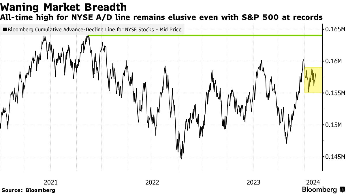 万特罗布斯基正在关注纽约证券交易所交易的股票的Bloomberg先进-衰退线——这是另一个流行的技术指标。它仍远低于2021年的峰值,并显示出购买力正在变得更加狭窄,即使美国主要股指创下纪录。