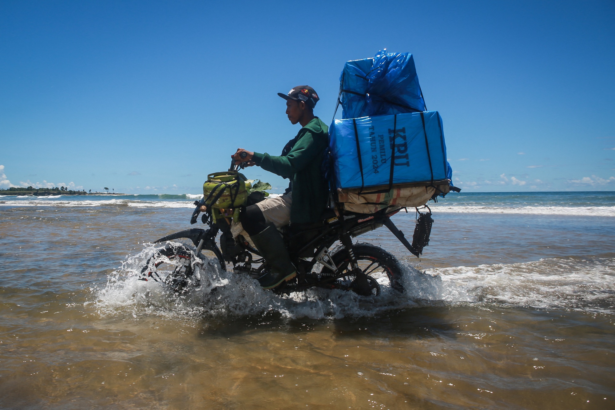 印度尼西亚朗普市的选举委员会物流单位成员于2月11日骑摩托车向偏远的投票站运送选举材料。