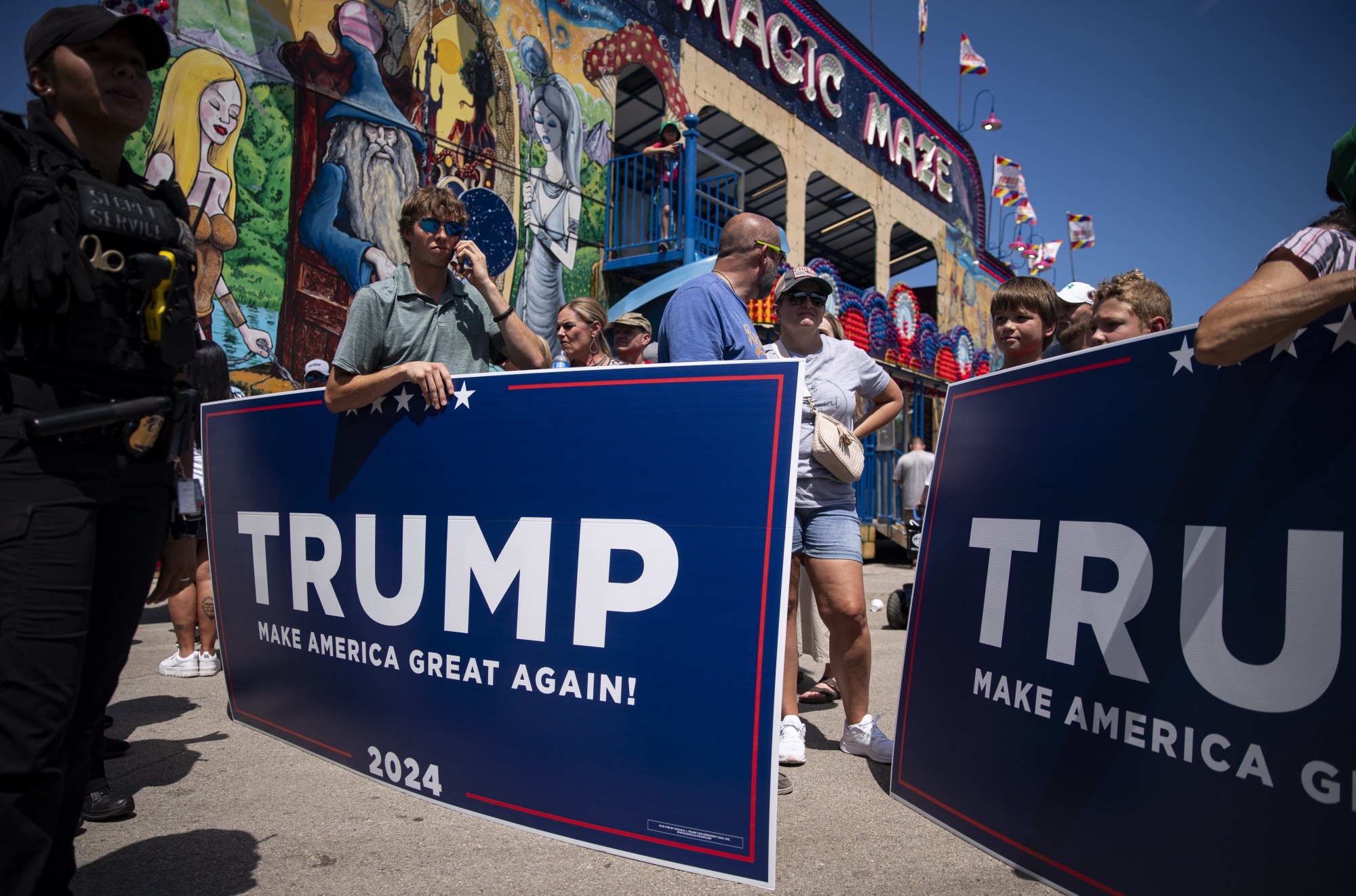 前美国总统唐纳德·特朗普在去年八月参加爱荷华州得梅因市的爱荷华州博览会时的竞选标识。摄影师:Al Drago/Bloomberg在威斯康星州西北部拥有并经营第五代家族乳制品农场的Cris Peterson和她的丈夫Gary是威斯康星州西北部的农村选民中的一员,他们是至关重要的争夺州农场,帮助特朗普击败希拉里·克林顿赢得胜利的。她说,特朗普对农业的持续关注是吸引人的关键部分。