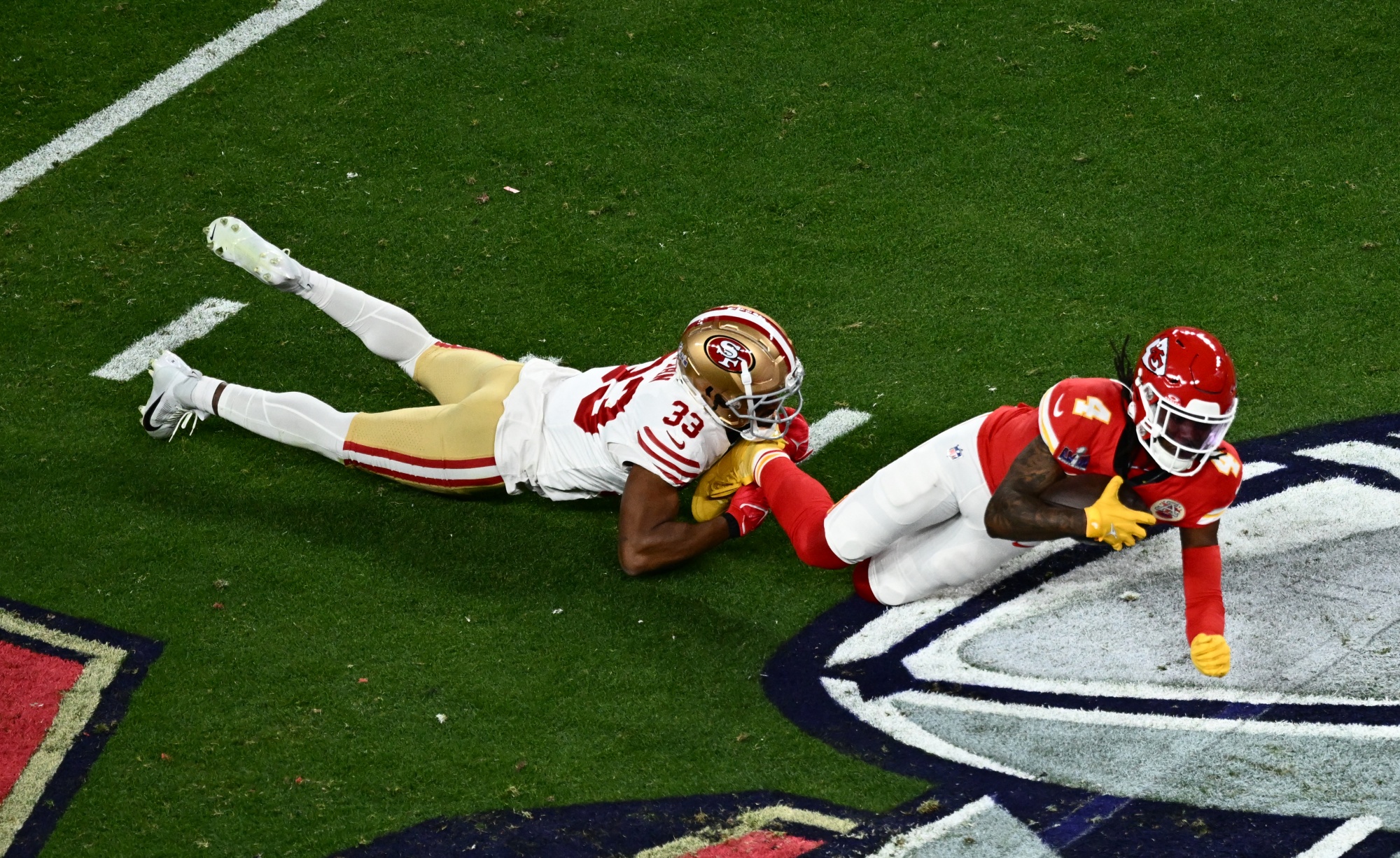 旧金山49人队的安全员Logan Ryan在2月11日的第LVIII届超级碗比赛中扑倒了堪萨斯城酋长队的广大接球手Rashee Rice。