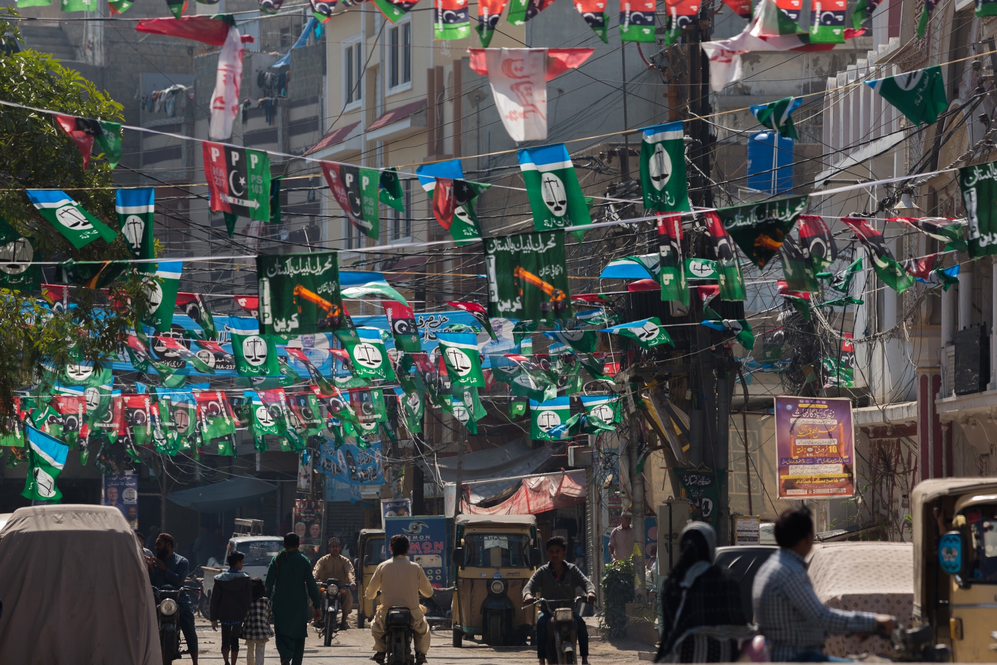 政治横幅和旗帜横挂在卡拉奇的街道上。