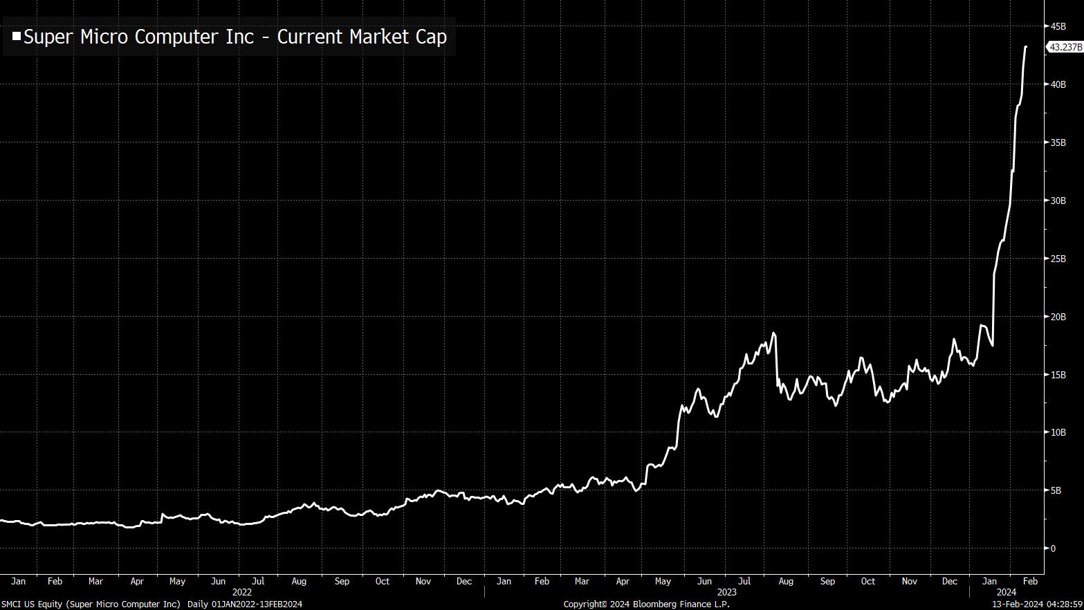 另一家乘着人工智能浪潮的公司Super Micro,在年初时市值约150亿美元。今天已接近450亿美元。