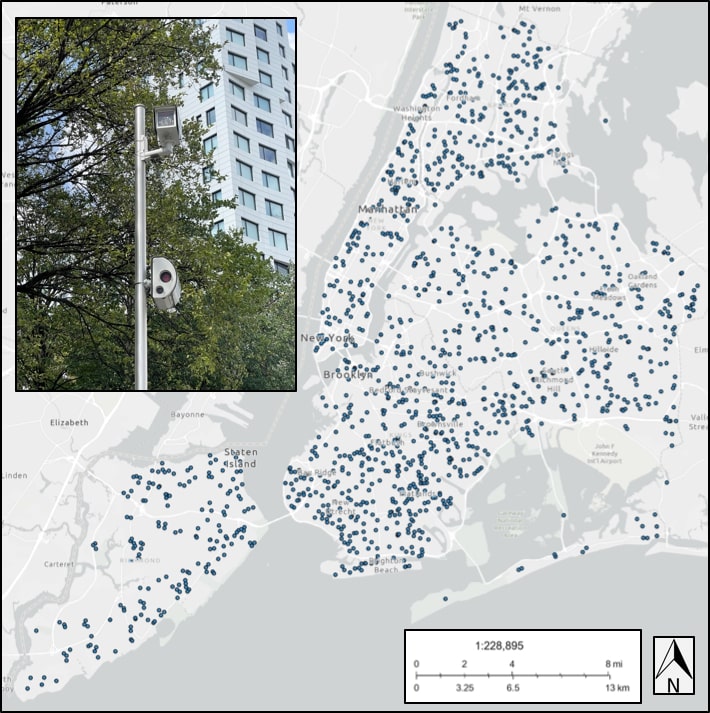 截至2022年,纽约市五个行政区共有约2500台测速摄像头,是美国最大的测速摄像头网络。马塞尔·莫兰提供莫兰表示,超速行为也反映了更大的危险驾驶行为。数据显示,肇事者平均还有35次非超速交通违规行为,如阻塞自行车道、违规停车或闯红灯。而且大多数是私家车,而不是商用车辆或出租车。