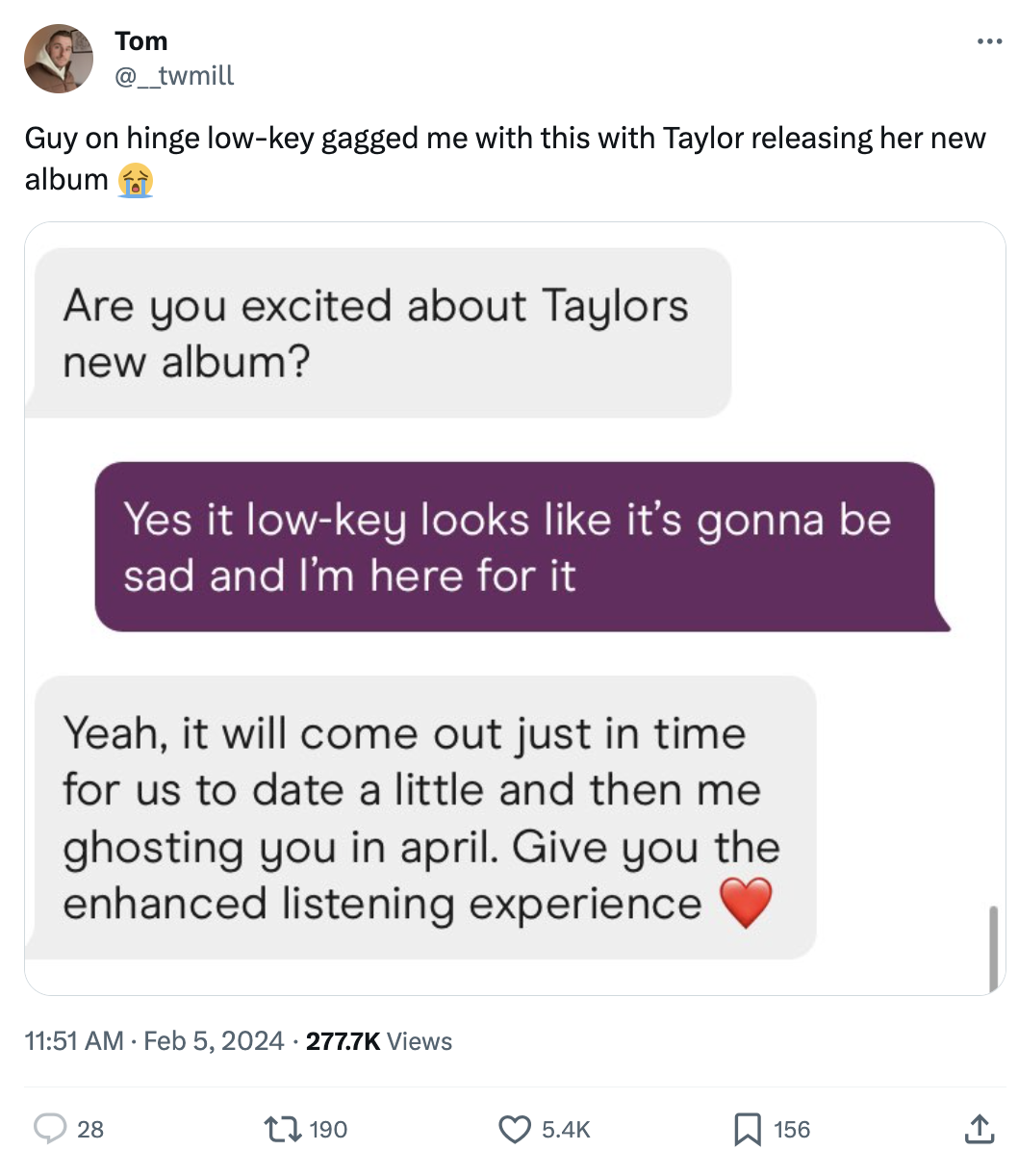 额外的情人节听觉享受:关于约翰·奥瑟斯有趣的一点是,他不仅仅是写每日简报。他还为他的读者策划播放列表!我知道,我知道。我得加把劲了。情人节,他准备了一份特别的歌单,肯定会让你的听觉味蕾愉悦。里面有仙妮亚·特温、西蒙和加芬克尔,当然还有泰勒·斯威夫特。你可以在Apple Music或者Spotify上找到它。