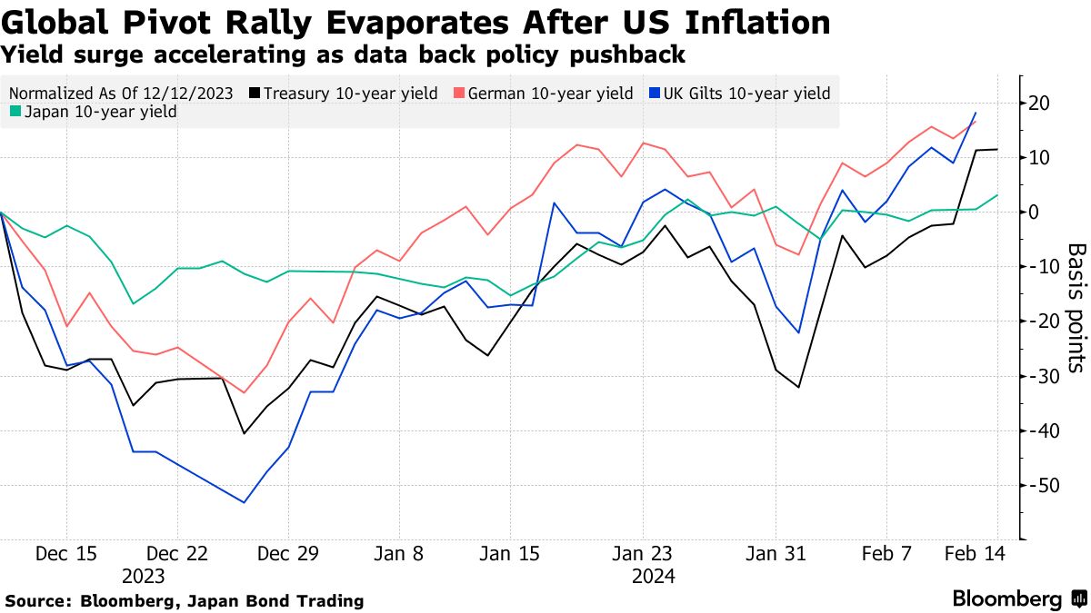 随着美联储主席鲍威尔率领其他主要央行强烈反对市场对央行可能在3月开始快速宽松的预期,全球债券今年大幅下挫。在周二的数据显示美国1月份的通胀强于预期后,交易员推迟了对首次美联储降息的预期,加速了这一跌势。