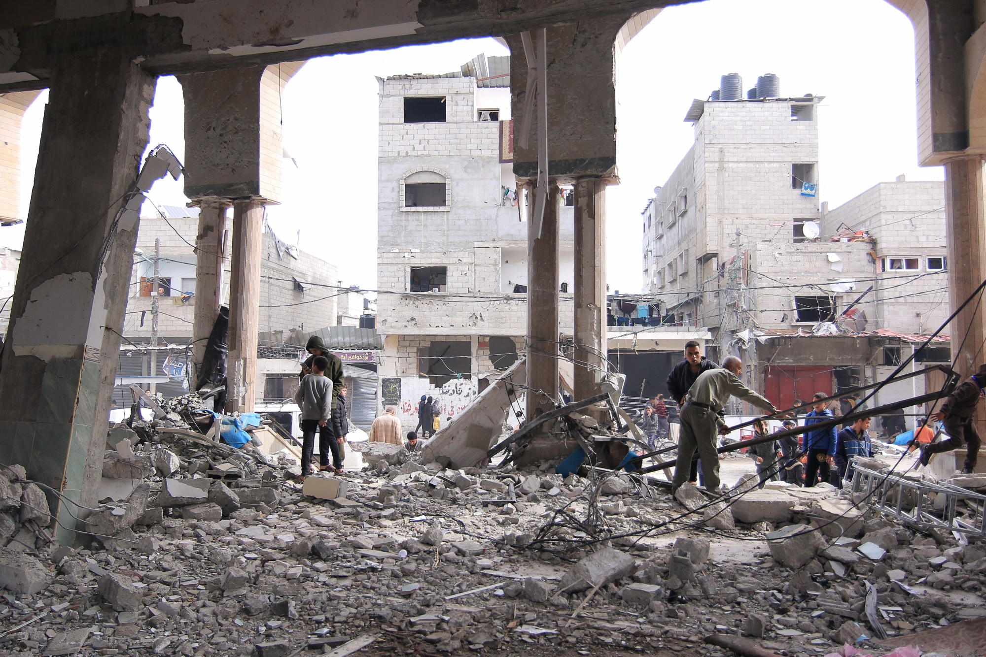 巴勒斯坦人清理了拉法的Al-Huda清真寺遭到以色列军事行动摧毁后的残骸,日期为2月12日。