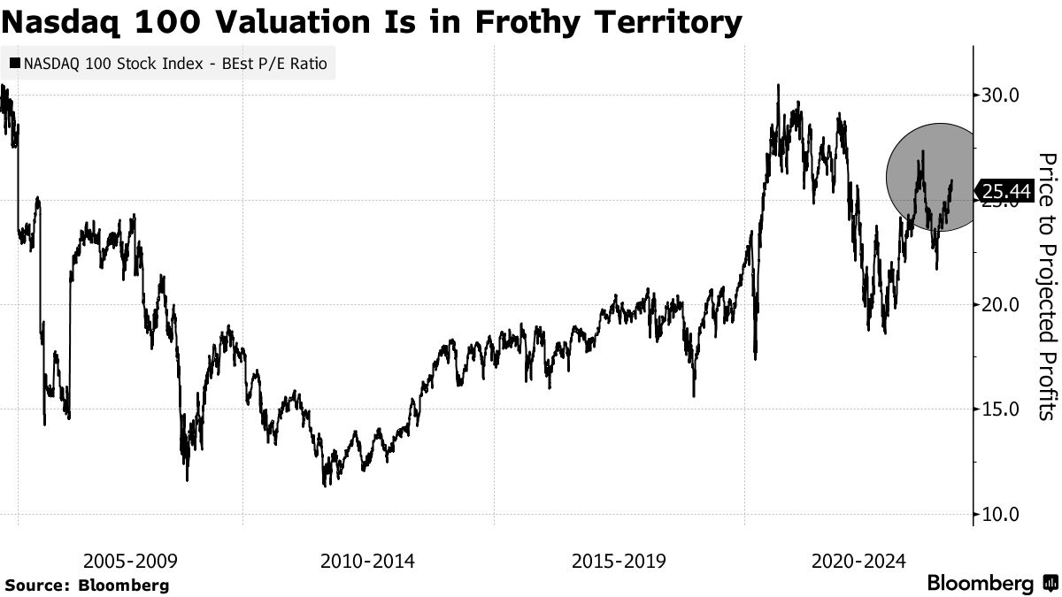 Nasdaq 100自10月底至周一上涨了27%,将基准价格相对于预期利润的比值推高至25以上。微软的价格为32倍,而网络安全公司Palo Alto Networks Inc.的价格超过60,软件制造商Cadence Design Systems Inc.的价格约为50。美国银行策略师警告说这种飙升类似于互联网泡沫破裂前的激增。其他资产管理人员也加入了这一论调。