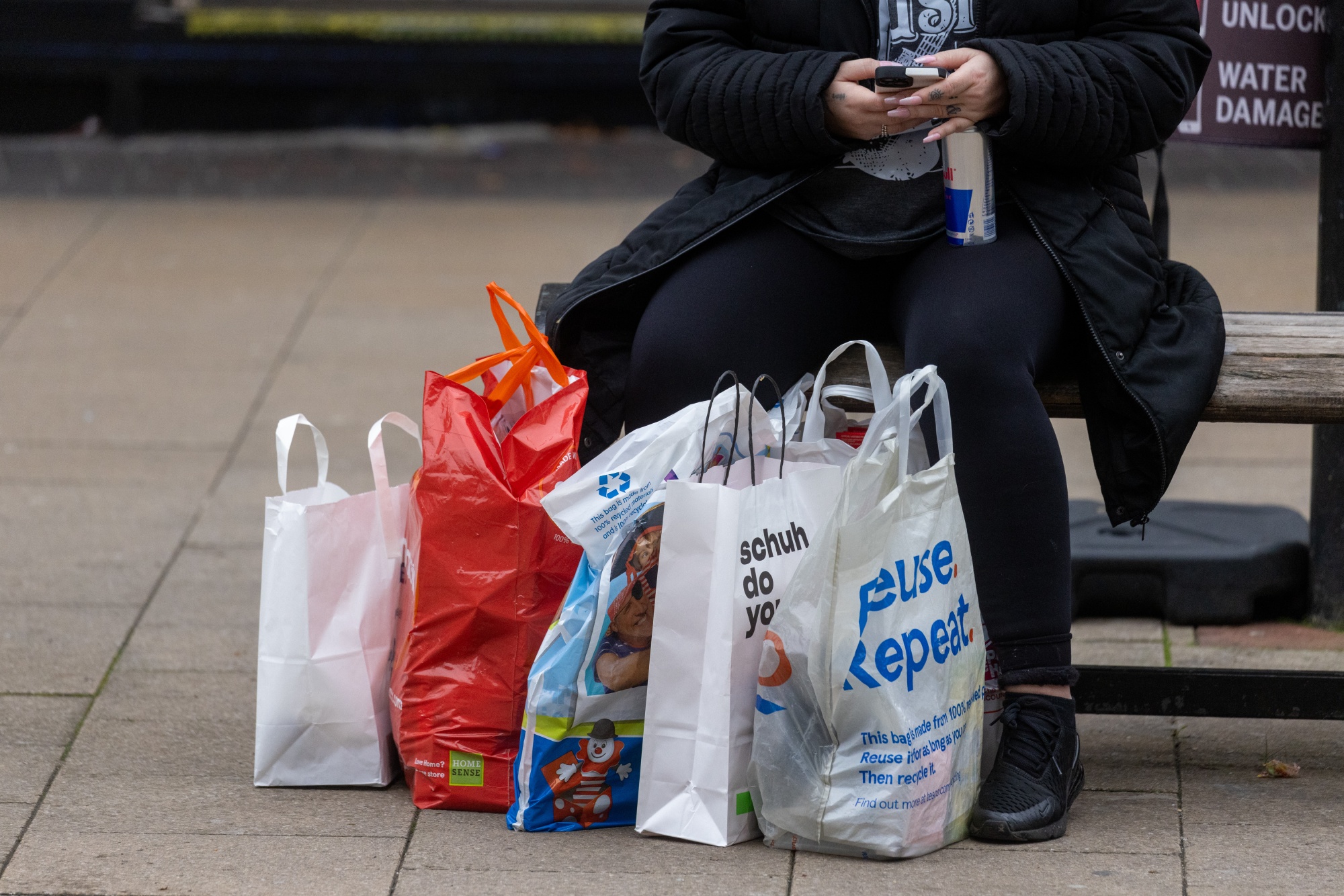一个购物者坐在伦敦贝克斯利希斯高街的长椅上