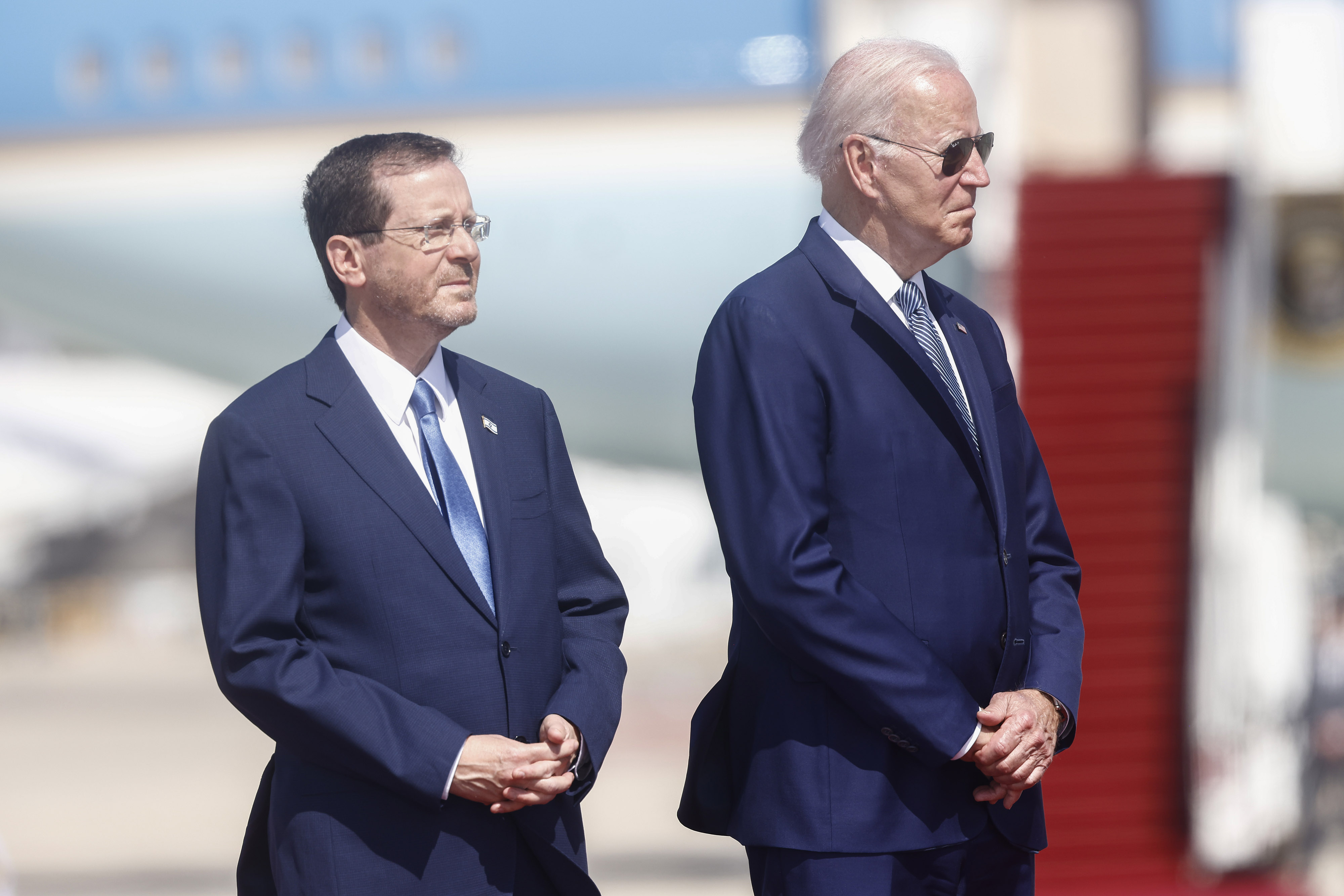 以撒·赫尔佐格,以色列总统,左,和美国总统乔·拜登。摄影师:科比·沃尔夫/彭博社