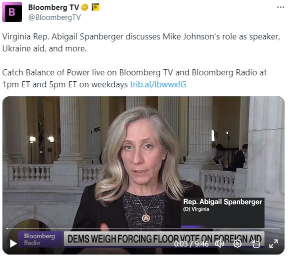 今天在彭博电视台的权力平衡早间版节目中,主持人乔·马修和凯莉·莱因兹就众议员阿比盖尔·斯潘伯格在众议院对乌克兰援助前景的看法进行了采访,大卫·韦斯汀与证券交易委员会主席根斯勒进行了交谈。