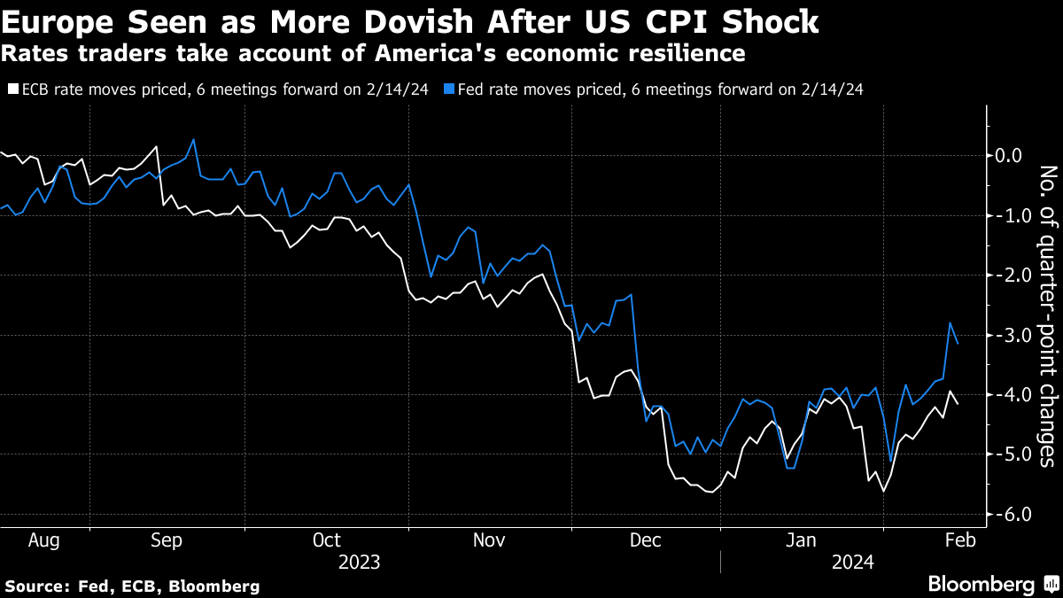美国出人意料的1月CPI报告似乎迫使市场考虑主要央行今年不会一致降息的可能性。交易员对美联储放缓的押注比对欧洲央行的押注更为激烈。