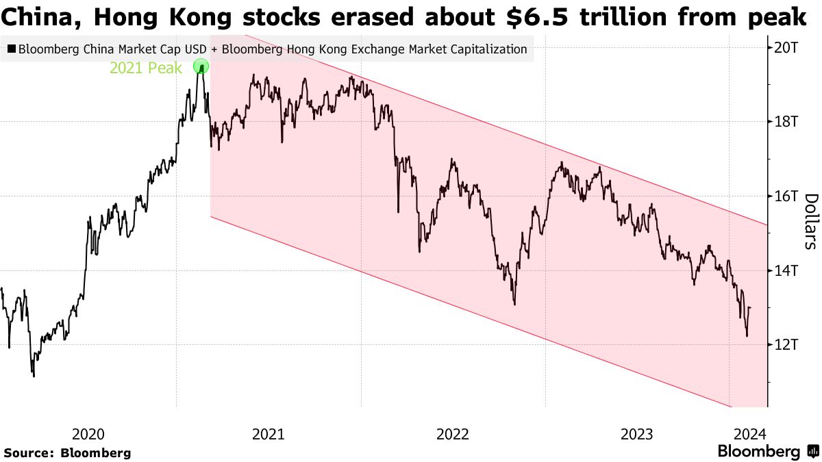截至周二,中国和香港股市从2021年高点以来已经蒸发了约6.5万亿美元的市值,凸显出北京在试图遏制投资者信心下降方面面临的挑战。