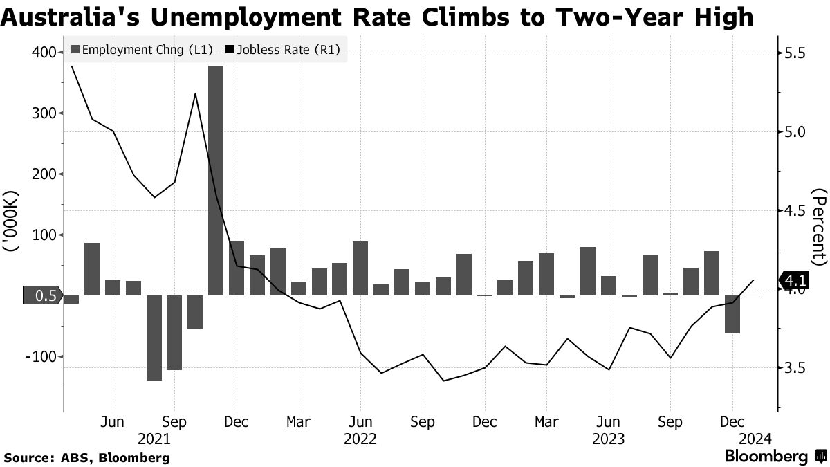 澳大利亚统计局数据显示,1月份经济新增了500个职位,远低于预期的2.5万个增幅,并不足以压低失业率。周四,失业率从3.9%上升至4.1%,而参与率保持稳定。