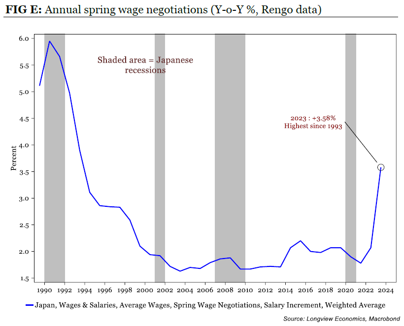 日本仍然生活在一个镜中世界,雇主和工会可以共同宣布他们希望工资涨幅超过通货膨胀。正在进行新年合同谈判的过程,被称为春闰。这被普遍认为是政策制定者试图摆脱通货紧缩陷阱的关键。如果变得明显工人在通货膨胀之前没有获得加薪,央行可能被迫只非常缓慢地收紧。但去年的春闰看到了三十年来最大的涨幅。伦敦Longview Economics的Chris Watling在下面的图表中指出,人们仍然普遍预期今年会有进一步的工资通胀。“这应该在某个阶段带来日本央行政策的正常化,以及日元走强的阶段,”他说。“风险,一如既往,是多方面的,包括持续/复苏的美国通货膨胀(以及美国加息的进一步/持续排除)。