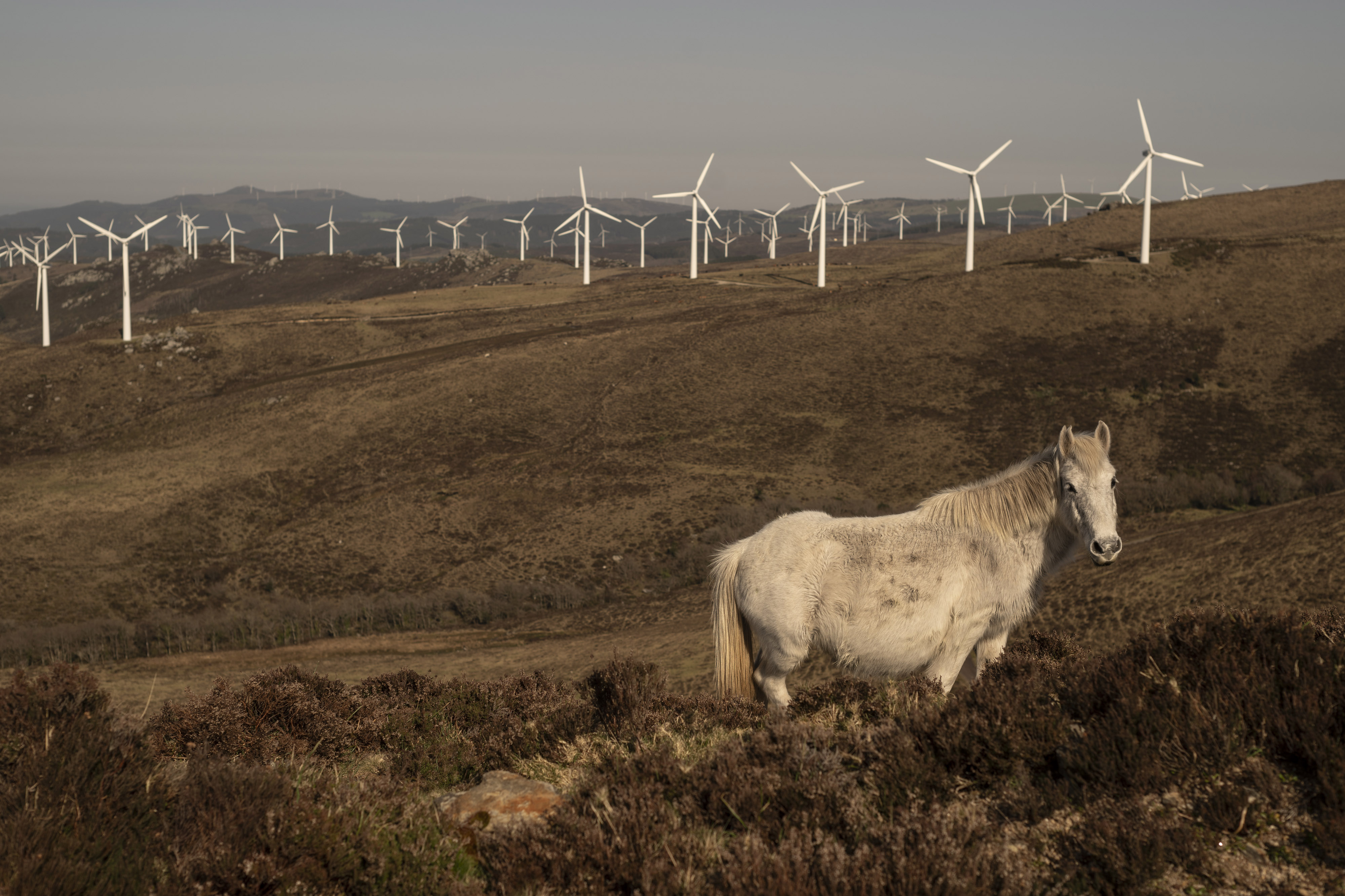 西班牙穆拉斯(Muras)风电场附近的野马。