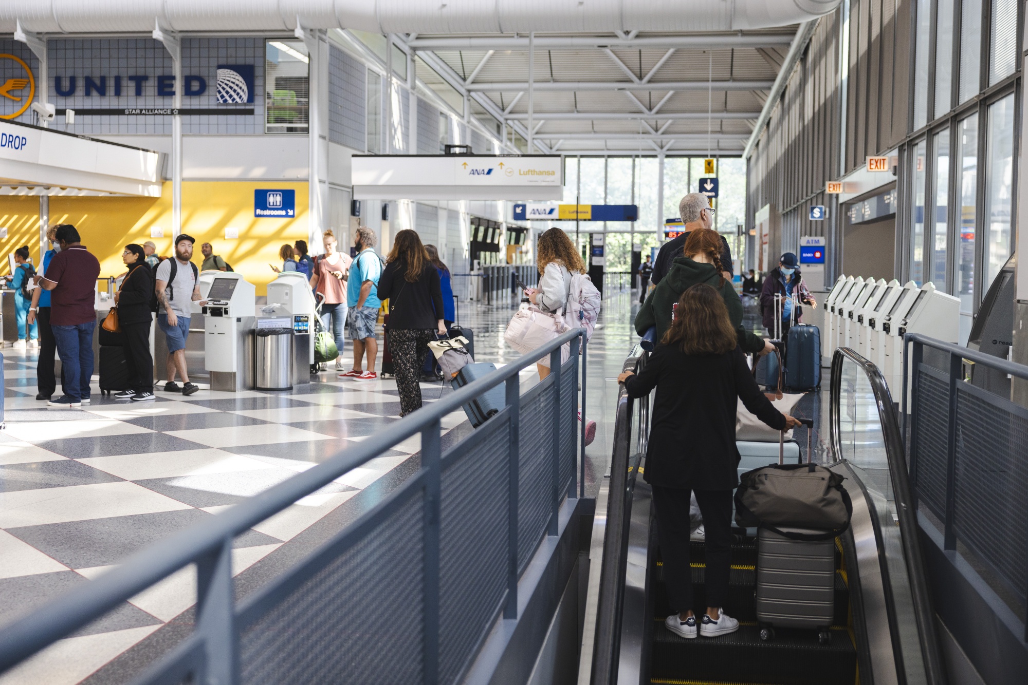 旅客们乘坐自动扶梯前往芝加哥奥黑尔国际机场1号航站楼。