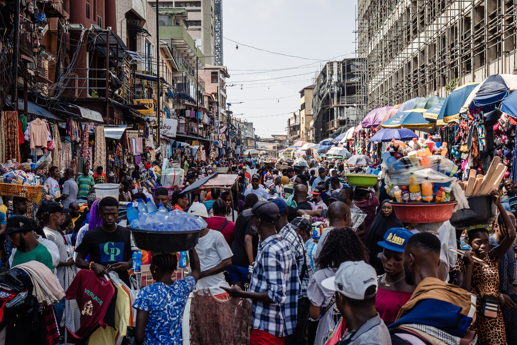 在拉各斯市场上的购物者和交易商。