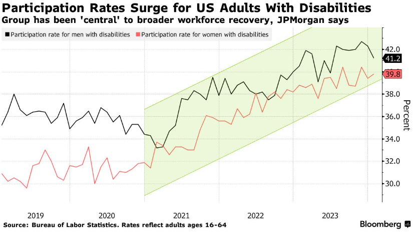 根据摩根大通首席美国经济学家迈克尔·费罗利的分析,尽管残疾人口仅占美国成年人口的约12%,但在过去三年中,残疾人口占劳动力增长的比例接近三分之一。官方数据显示,残疾男性和女性的参与率去年创下纪录,并且仍然接近这些水平。