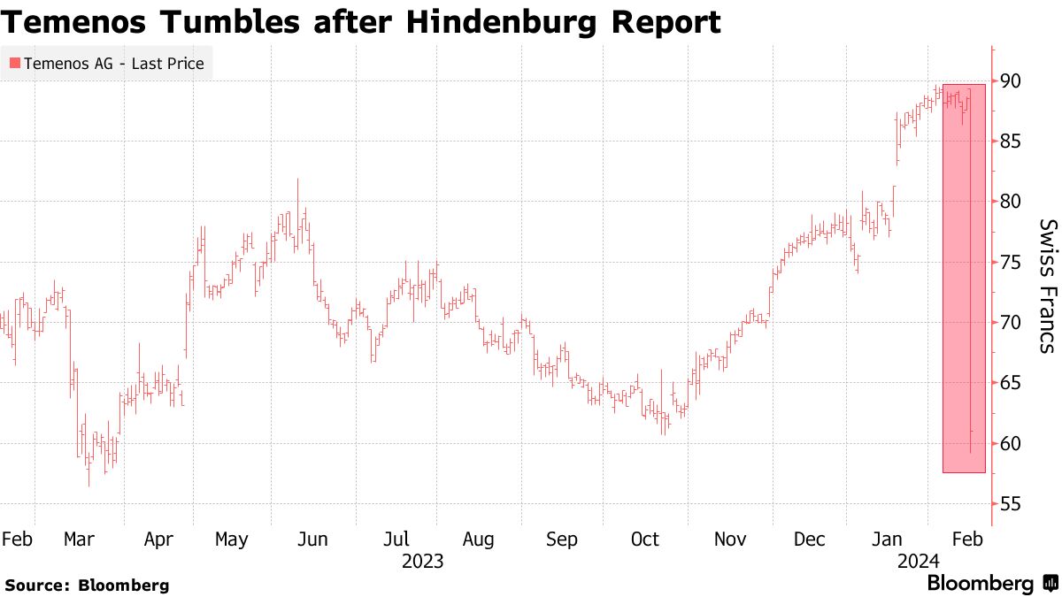 Temenos AG暴跌高达33%,使其市值缩水24亿美元,此前Hindenburg Research声称瑞士银行软件公司的账目存在严重缺陷,并做空了该股。