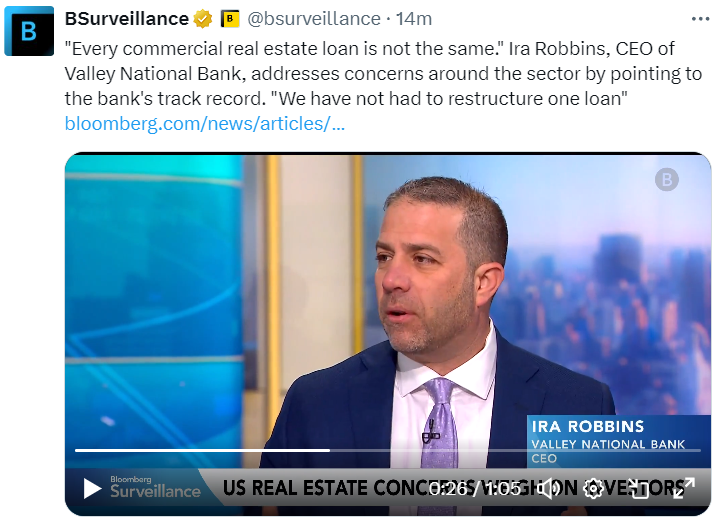 那么,在商业地产贷款和拖欠信用卡借款人的令人担忧的消息中,地区银行内部的看法是什么?Valley National Bancorp 的 Ira Robbins 在涉及消费者负债(“令人恐慌”)到商业地产风险(他持谨慎态度,但控制在手中)等话题上提供了各种回应。