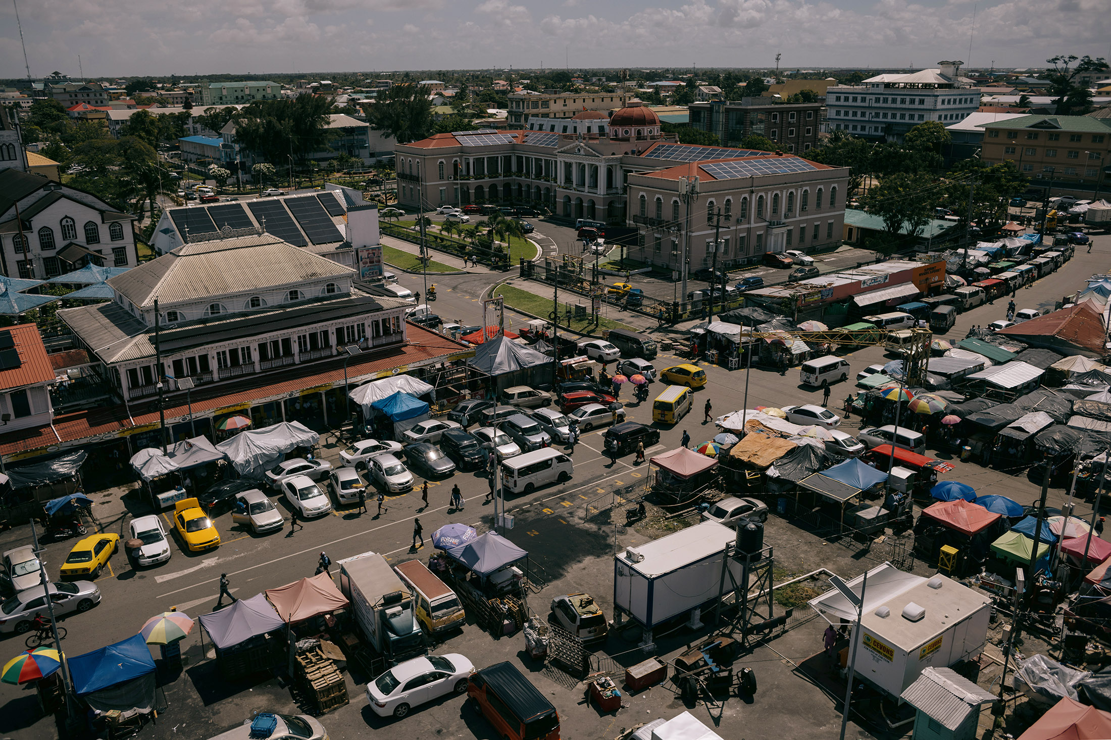 圭亚那的政府所在地在乔治敦的斯塔布鲁克市场上方高耸,市场上盖着篷布的摊位随处可见。摄影师:José A. Alvarado Jr./彭博社“我还没见到,更别说尝过了,”55岁的科温·赖特谈到了他国家新发现的财富。他在附近的斯塔布鲁克市场上卖遮阳帽和棒球帽,那里有数百个摊贩在盖着篷布的摊位下争夺路人的注意,希望兜售从芒果和甘蔗汁到新鲜捕捉的帕库鱼等各种商品。