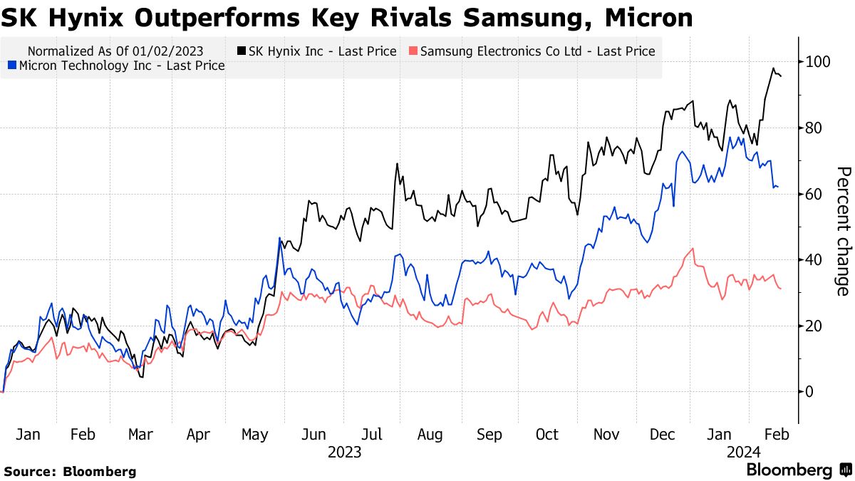 关键在于SK海力士在高带宽内存(HBM)市场上抢得先机,这种内存可以以人工智能所需的高速提供大量数据。这帮助它在多年来一直排名第二的情况下吸引了更多投资者的关注。