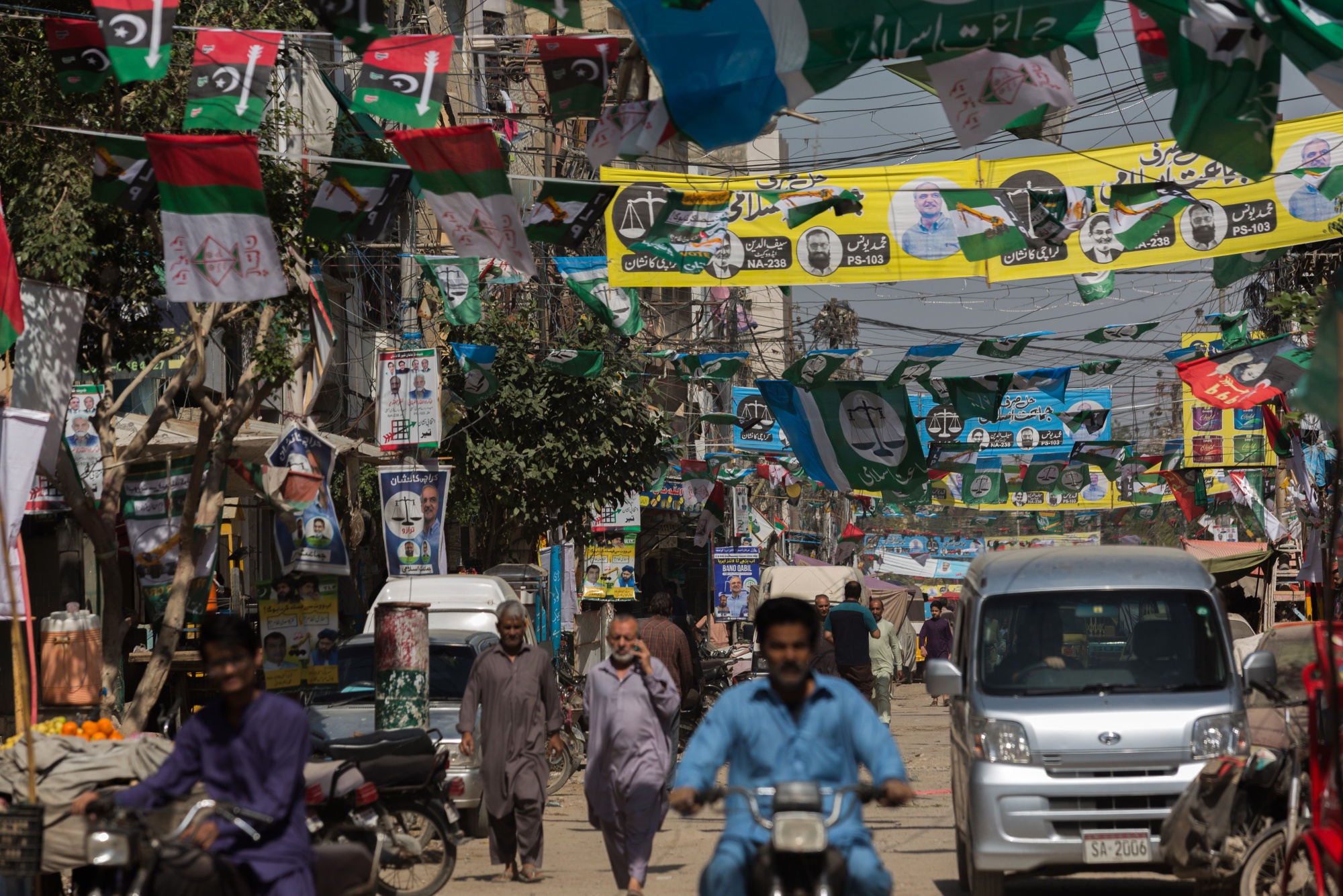 政治横幅和旗帜悬挂在巴基斯坦卡拉奇的街道上。
