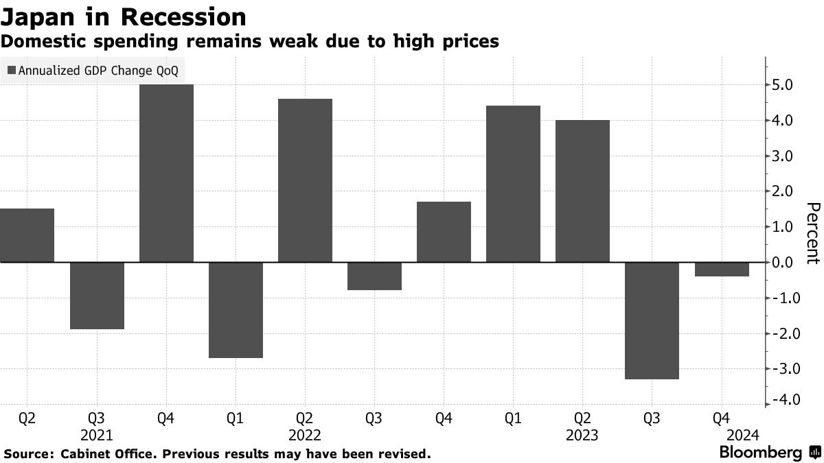 摄影师:Kentaro Takahashi/Bloomberg在陷入技术性衰退后,日本已经失去了作为世界第三大经济体的地位,被德国取代。这一意外的发展发生在东京股市几乎达到1989年峰值的情况下。经济的脆弱性使日本央行在何时首次自2007年以来提高利率的决定变得复杂,这是一个被广泛预期的举措,可能会提振疲弱的日元。