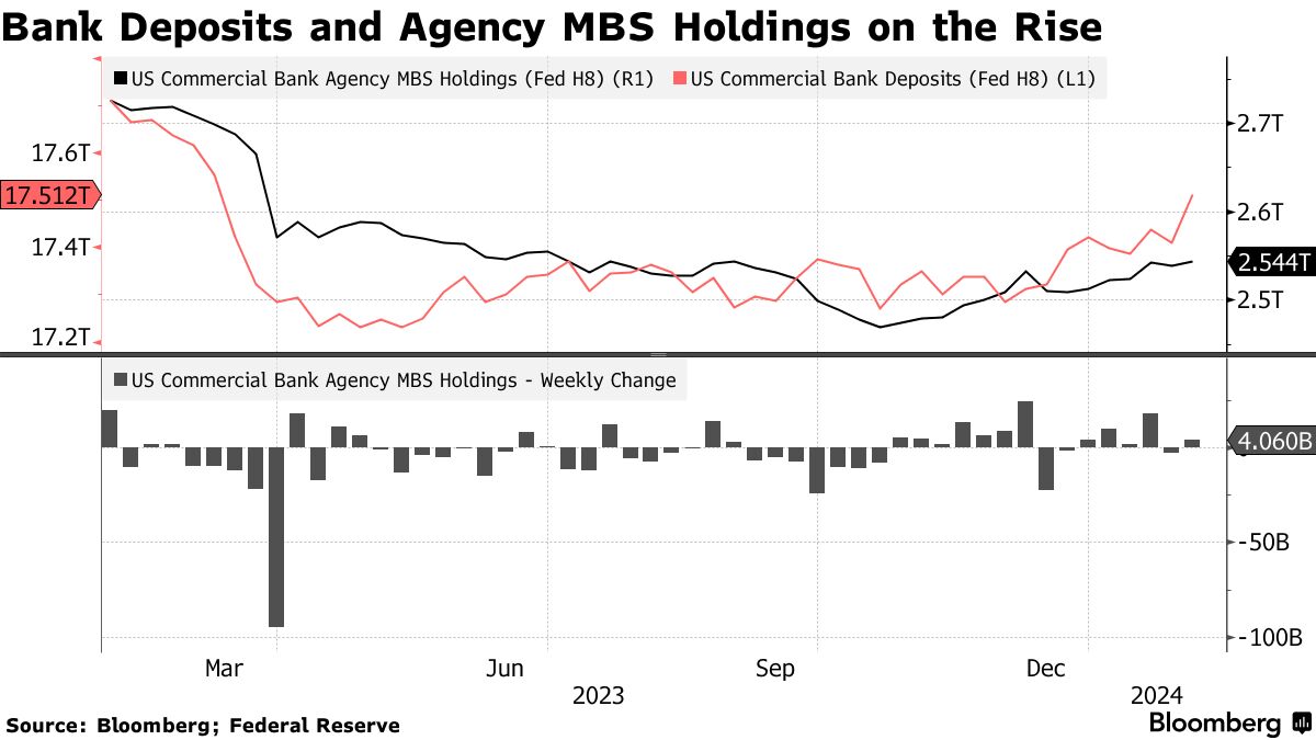 在机构MBS方面,银行已经有一年多时间基本上没有行动,但自去年10月底以来,持有量已经增加了740亿美元。这一逆转与利差显著收窄同时发生。