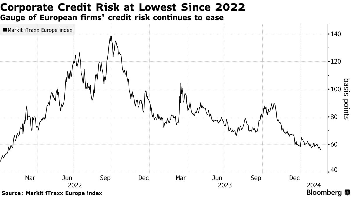 根据彭博社编制的数据,追踪高评级公司违约风险的Markit iTraxx欧洲指数已降至56.1个基点,为自2022年1月以来的最低水平。追踪垃圾评级公司债券的类似指数也回到了两年前的低点。