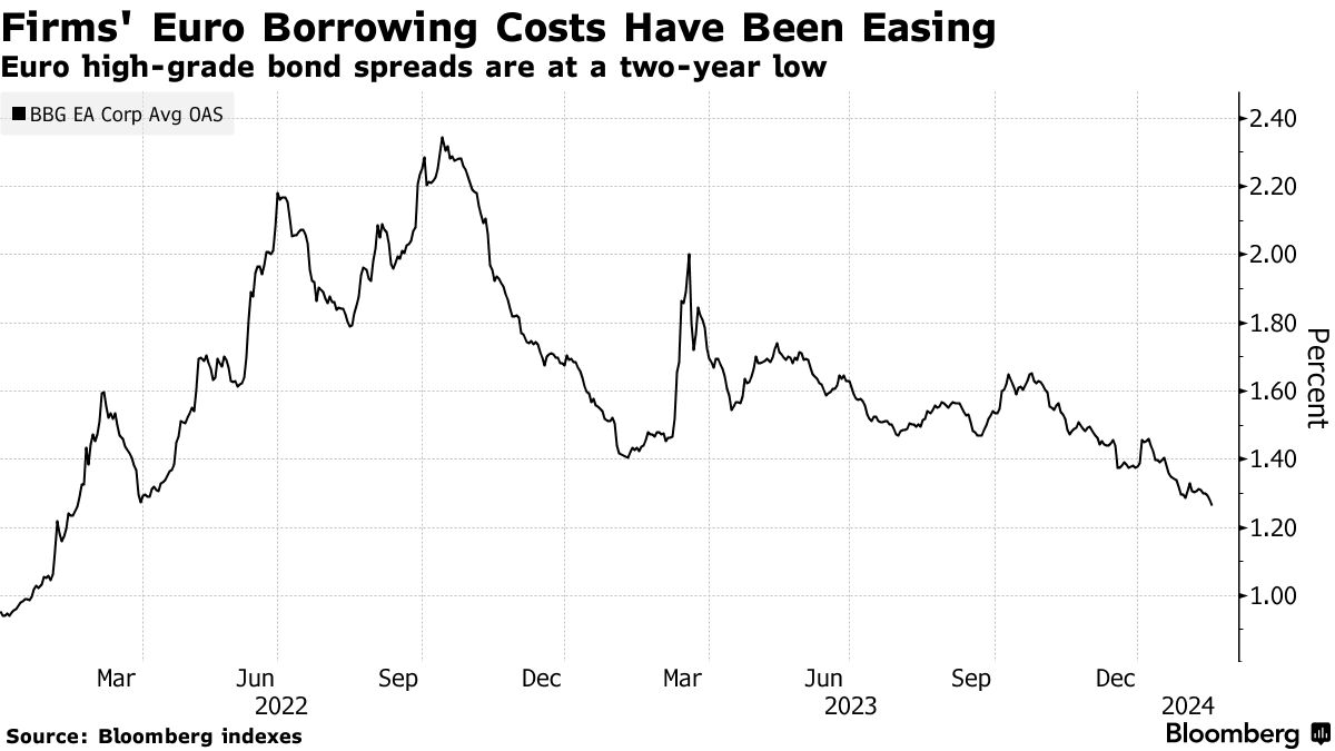 今年企业信贷利差也在收窄,根据彭博指数,欧元计价的高评级借贷成本目前约为126个基点,是自2022年2月以来最低。
