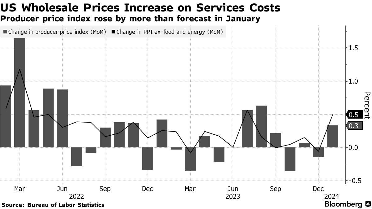 本周另一份报告显示,消费者价格指数在年初出现了上涨,批发价格数据可能会再次证实美联储将暂停降息,直到官员们确信通货膨胀得到了充分控制。