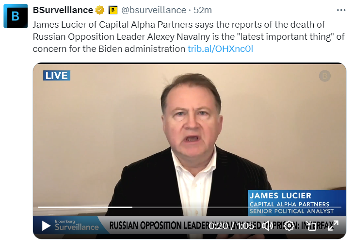 彭博社的格雷格·沙利文指出,美国几乎没有什么影响力,因为由于普京入侵乌克兰,俄罗斯在全球基本上是一个被孤立的国家。但纳瓦尔尼的死亡增加了华盛顿的紧迫感,乌克兰援助在国会受阻,莫斯科的反卫星武器引起了新的警报,Capital Alpha的詹姆斯·卢西尔说。
