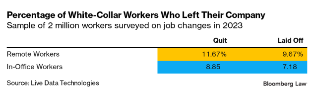 Live Data Technologies Inc.在一月份的一项调查发现,2023年,完全远程的白领工作者比至少在办公室工作一些时间的同事更有35%的可能性被裁员。这家跟踪工作趋势的软件开发公司分析了两百万名工作者的样本,还发现远程员工晋升的可能性要低31%。