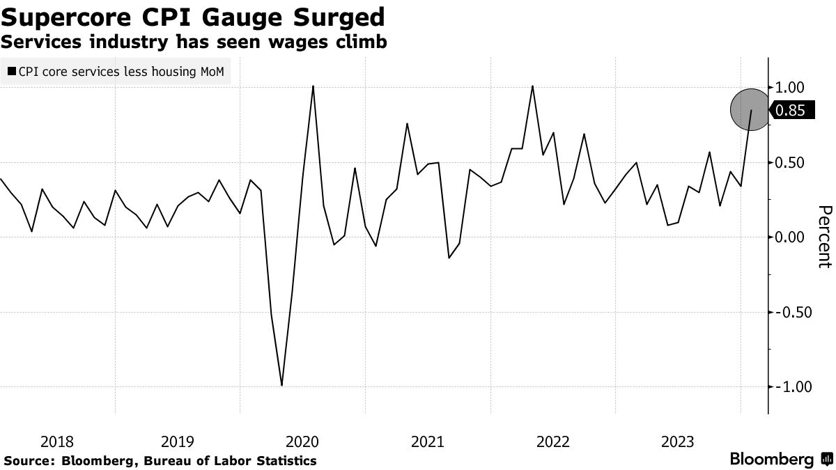 他说:“这并不是唯一令人不安的迹象。”另一个关键问题是核心服务价格——不包括食品和能源成本——除了住房,这些价格已经因较高的工资而上涨。“看起来一月份的超核心指数确实是爆炸性的,”他在谈到这一指标时说。