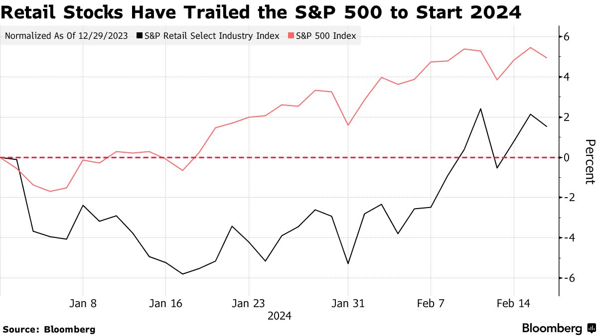 乐观的业绩和指引也有望提振该行业的股价,该行业的股价在2024年初落后于市场。标普零售选择行业指数上涨了1.5%,而标普500指数上涨了约5%。