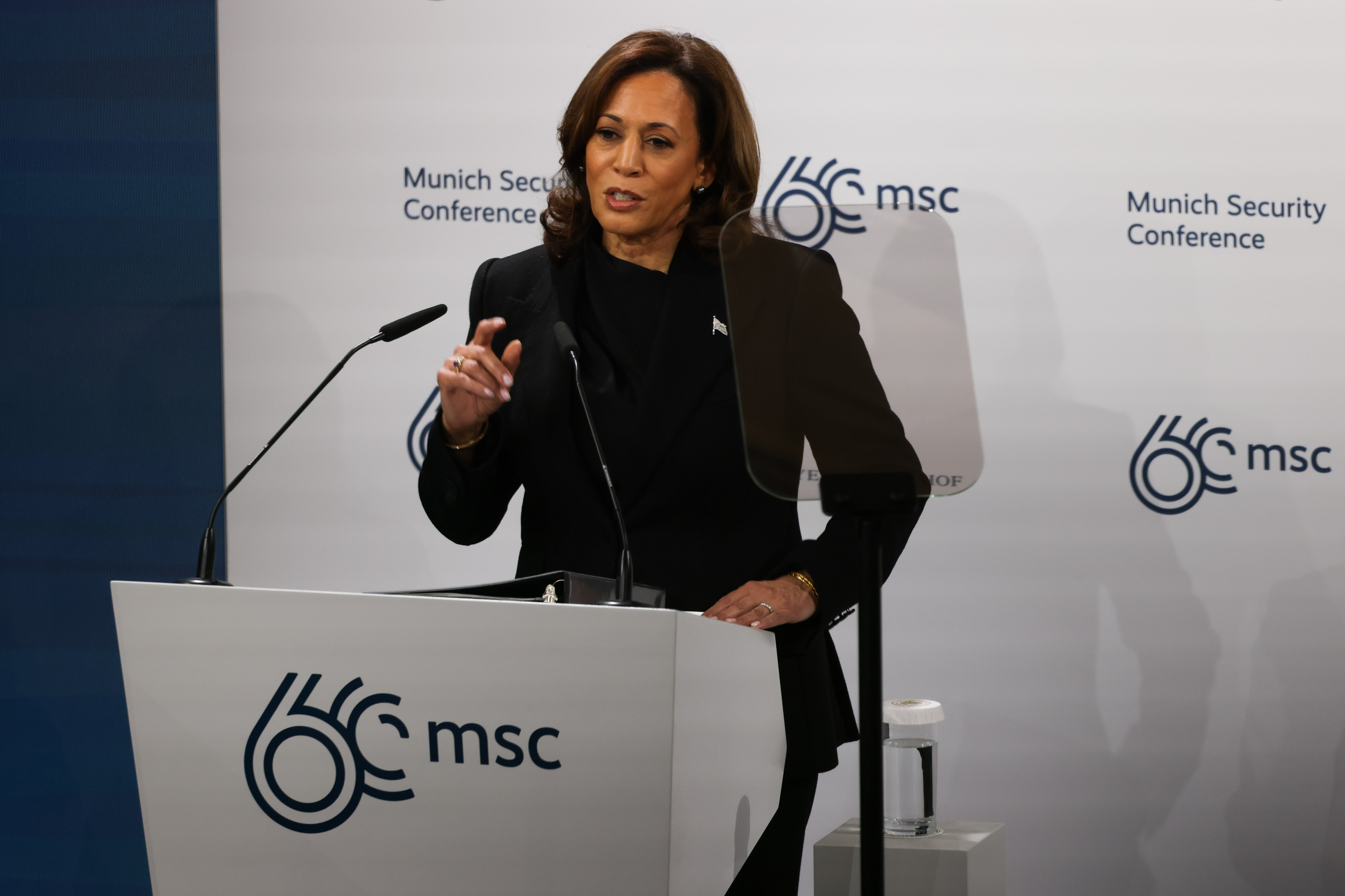 美国副总统卡玛拉·哈里斯在慕尼黑会议开幕式上发表讲话,谴责特朗普的观点,却从未直接提到他的名字,与此同时,由于组织失误,排队等候听她演讲的与会者被拒之门外。