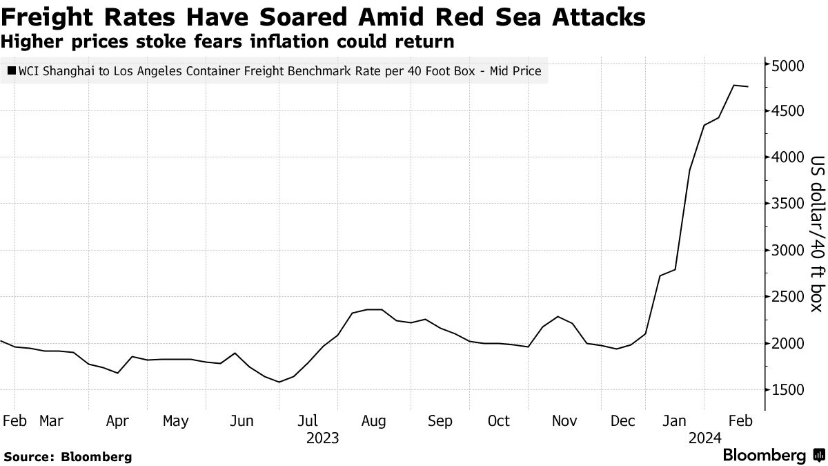 今年原油价格已经上涨,部分原因是担心以色列-哈马斯战争可能升级为更广泛的冲突。与此同时,由于伊朗支持的胡塞叛军发动袭击,迫使集装箱船只不得不避开红海和苏伊士运河,作为对以色列的一场战役的一部分。