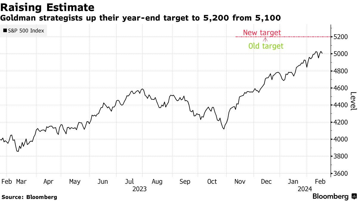 高盛集团的策略师们在设定2024年标普500指数目标仅几个月后,随着股市在本月突破了重要的5000点里程碑,第二次提高了他们的预测。