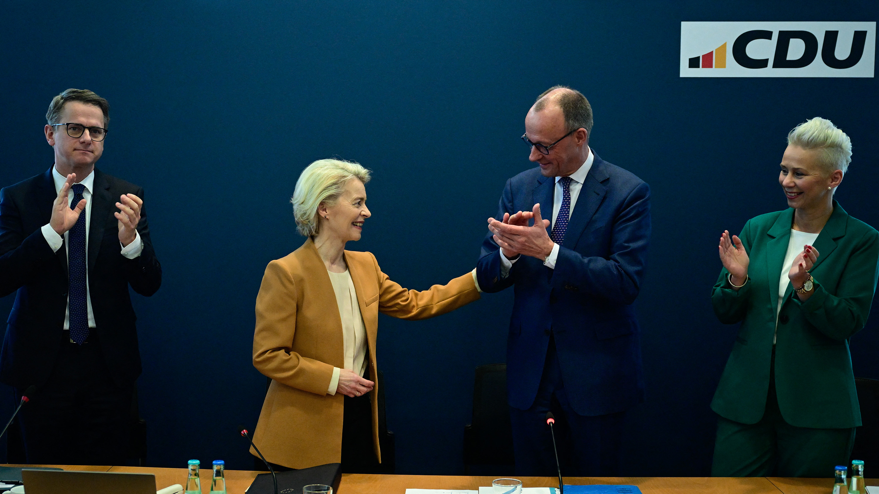 厄尔贝·冯·德·莱恩与基民盟领袖弗里德里希·默兹在德国柏林,2024年2月19日。