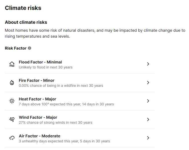 作为一个视觉辅助,这里是Redfin对我位于新泽西北部的家的气候风险估计,该地区越来越容易受到飓风和高温的影响,但从未发生过洪水(碰碰木头),几乎没有野火风险(因为新泽西北部):