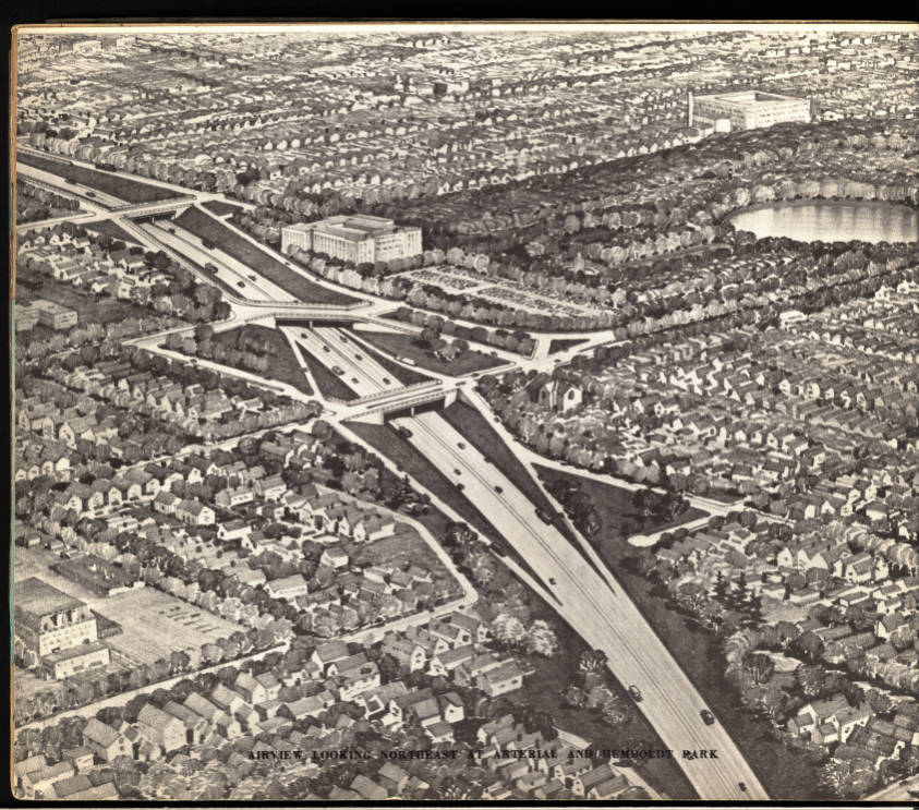 20世纪50年代对肯辛顿高速公路的未来设想。该高速公路的下沉部分于1971年完工。经布法罗和伊利县公共图书馆许可复制,位于纽约州布法罗在这里,高速公路规划者瞄准了布法罗街景的一颗明珠:洪堡大道。这条宽阔的、绿树成荫的林荫大道是19世纪末著名景观设计师弗雷德里克·劳·奥姆斯特德(Frederick Law Olmsted)在城市中串联的公园和绿地网络中的一个关键连接点。将这条阴凉的大道改造成近两英里长的高速公路沟渠,工人们砍伐了六排成熟的榆树和枫树,并拆除了600多栋房屋。