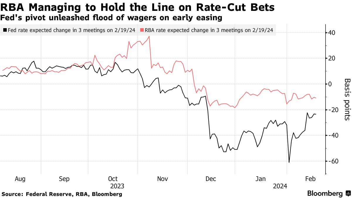 这解释了自2月6日会议以来,米歇尔·布洛克(Michele Bullock)行长相对鹰派的信息发布,这使得澳大利亚得以避开在美国和欧洲爆发的降息猜测狂潮,并在这些经济体中大幅放松了金融条件。