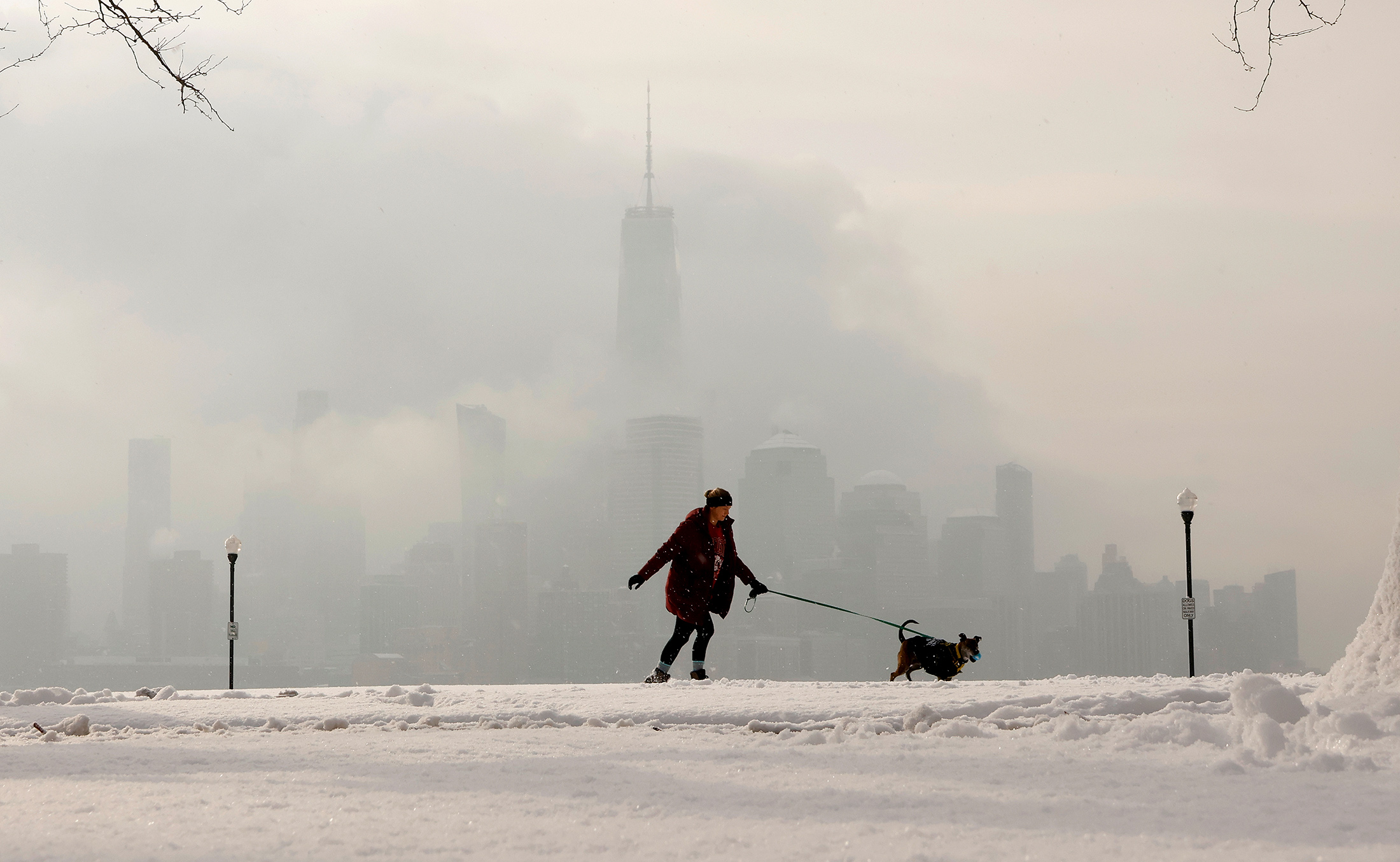 周六,一位居民在新泽西州霍博肯的河对岸雪覆盖的公园里遛狗,可以看到曼哈顿下城的天际线。