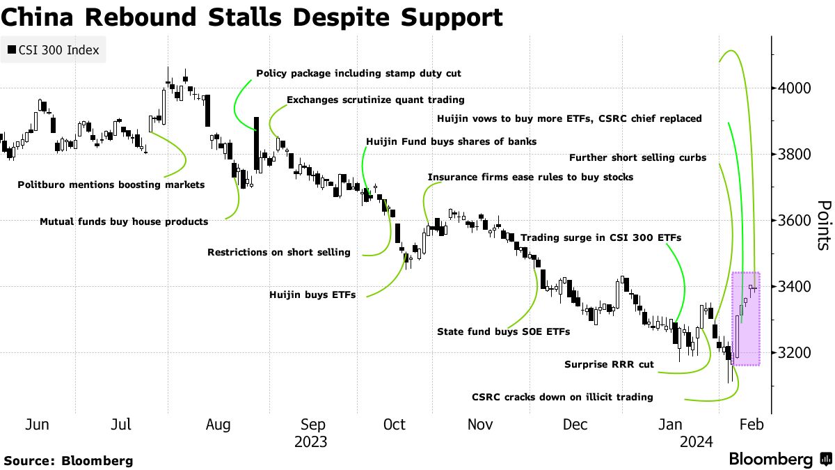 上海陆家嘴金融区的建筑。摄影师:Raul Ariano/Bloomberg自农历新年假期结束以来,中国股市一直难以获得动力,给北京带来了更多压力,需要提供更多支持,并恢复对正在应对房地产低迷和顽固通缩的经济的信心。