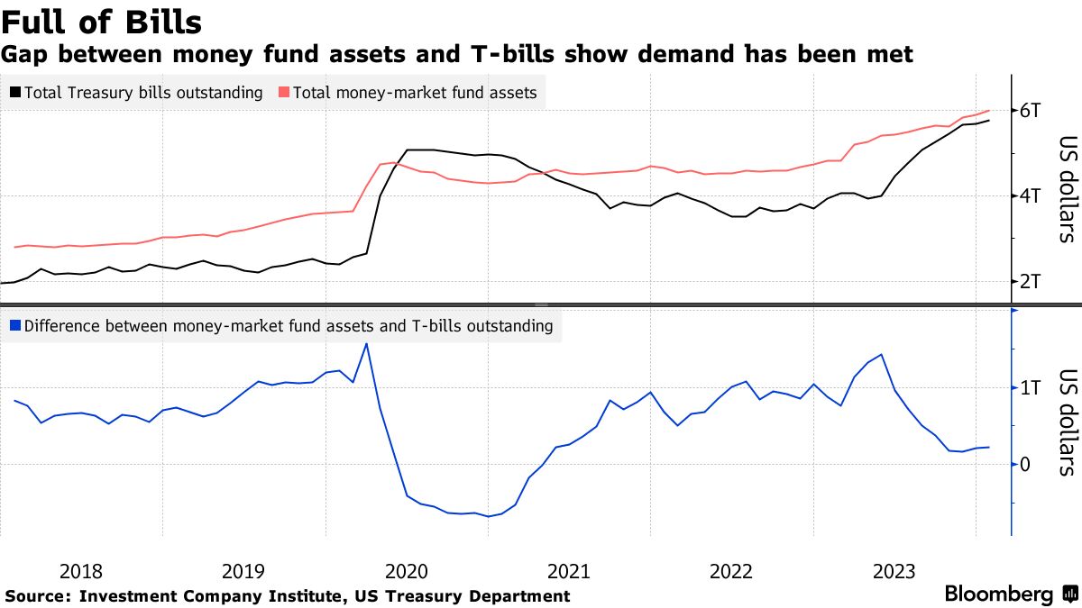 因此,去年有超过1万亿美元流入货币基金,这是ICI自2007年以来记录的任何一年中最多的。这些资金流入帮助货币基金跟上了国库券发行的增长,尽管货币市场资产总额与未偿国库券总额之间的差距在缩小,但仍表明对短期政府债务存在需求。
