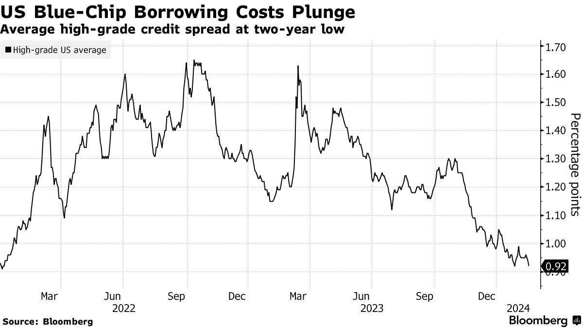 市场轻松吸收了新证券,投资者渴望在美联储开始降息之前锁定当前收益率。稳定的金融市场和对经济前景的信心也推动了一波计划中的企业并购活动,根据彭博社编制的数据,至少有3,140亿美元的待定并购交易可能在今年通过债券市场融资。